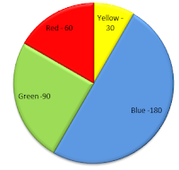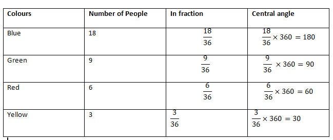 Draw a pie chart showing the following information. The table shows the colours preferred by a group of people.