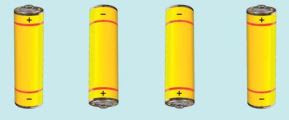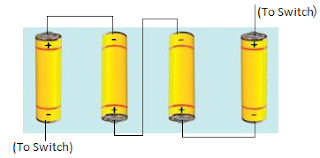Fig.14.22 shows four cells fixed on a board. Draw lines to indicate how you will connect their terminals with wires to make a battery of four cells.