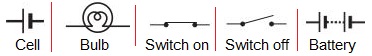 Draw in your notebook the symbols to represent the following components of electrical circuits: connecting wires, switch in the ‘OFF’ position, bulb, cell, switch in the ‘ON’ position, and battery.