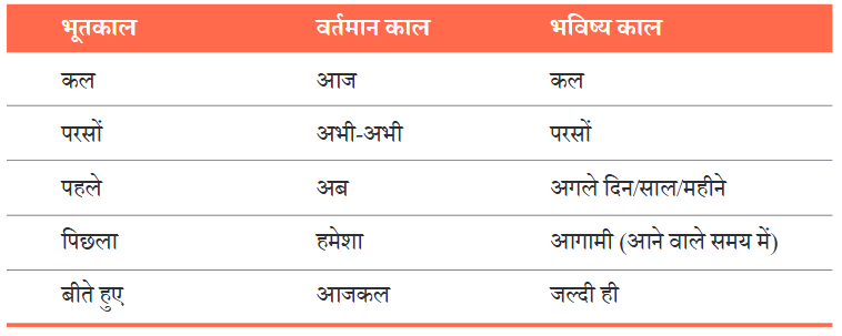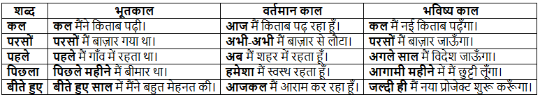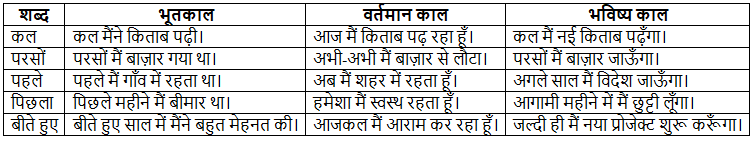 इस वाक्य में "बीती" शब्द अतीत यानी 'भूतकाल' के कार्यों को व्यक्त कर रहा है और "आगे" शब्द 'भविष्य' के कार्यों को व्यक्त कर रहा है। इसी प्रकार 'वर्तमान' समय में होने वाले कार्यों को 'आज' जैसे शब्दों से व्यक्त किया जा सकता है। रोचक बात यह है कि अनेक शब्दों का प्रयोग बीते हुए समय, आने वाले समय और वर्तमान समय को बताने वाले, तीनों प्रकार के वाक्यों में किया जा सकता है।