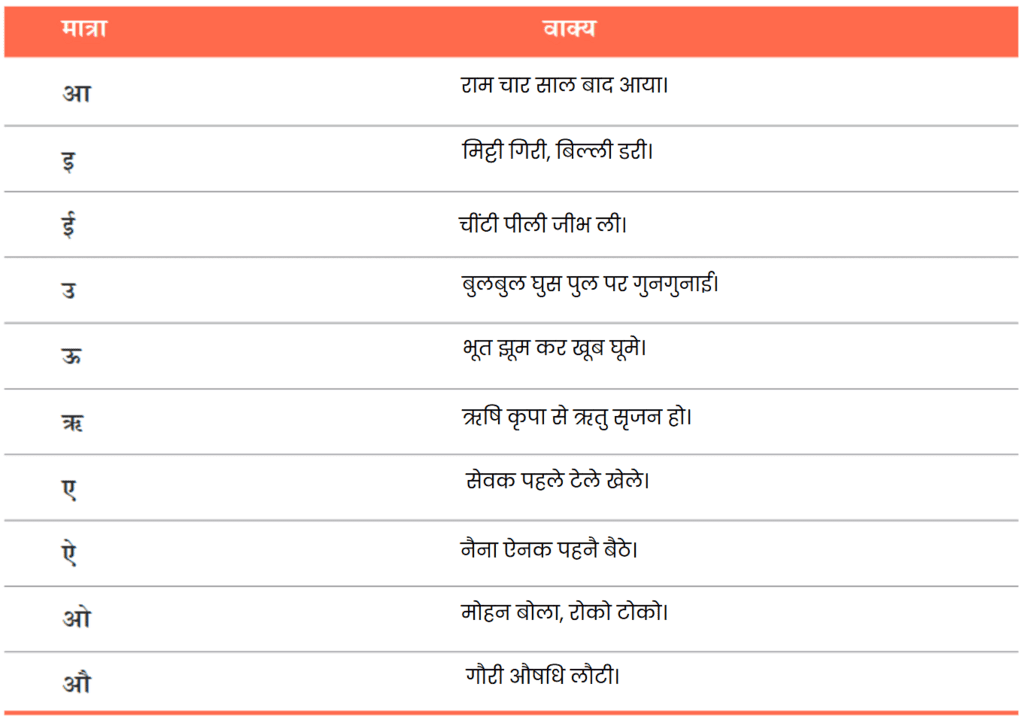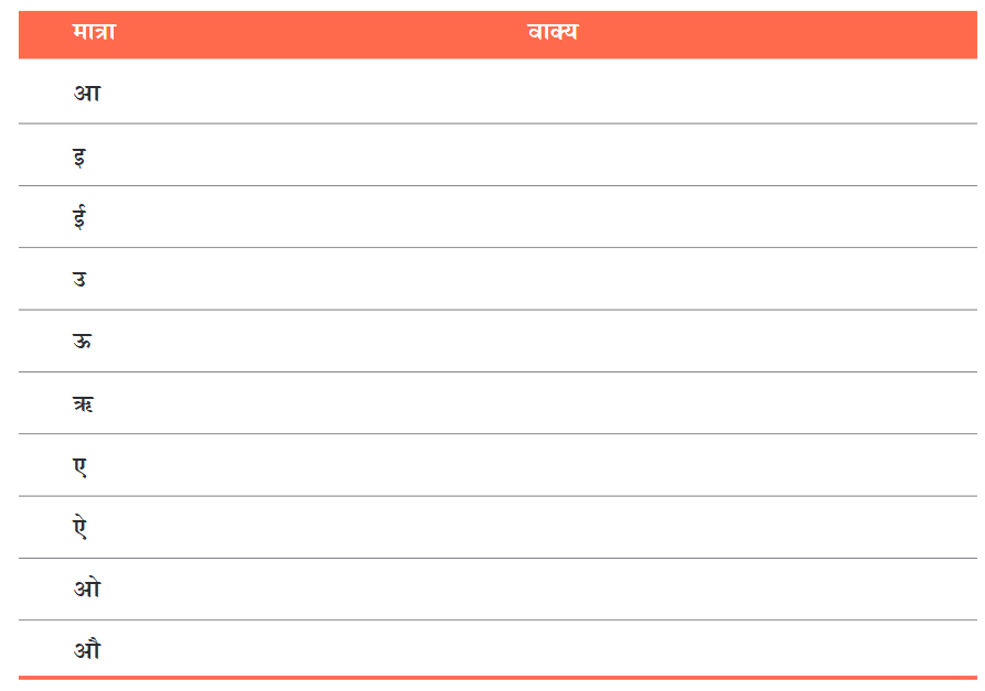 अब आप इसी प्रकार के वाक्य अलग-अलग मात्राओं के लिए बनाइए। ध्यान रहे, आपके वाक्यों का कोई न कोई अर्थ होना चाहिए। आप एक वाक्य में केवल एक मात्रा को बार-बार या बिना मात्रा वाले शब्दों का ही उपयोग कर सकते हैं।