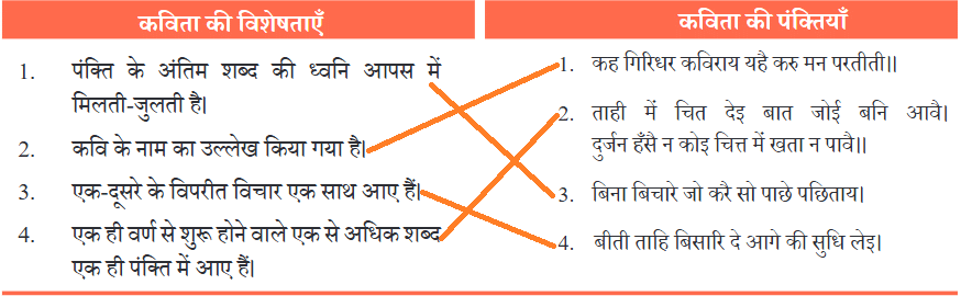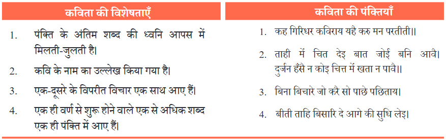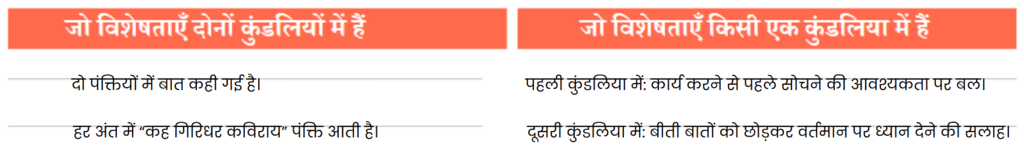 (क) अब आप पाठ में दी गई दोनों कुंडलियाँ को ध्यान से देखिए और अपने-अपने समूह में मिलकर इनकी विशेषताओं की सूची बनाइए। अपने समूह की सूची को कक्षा में सबके साथ साझा कीजिए।