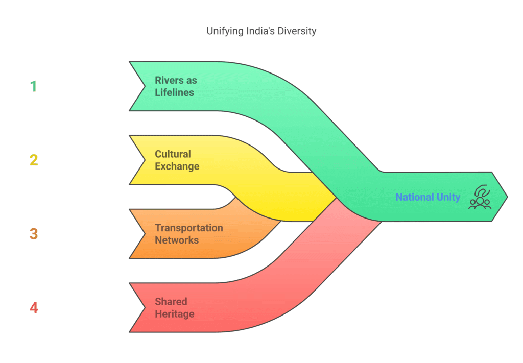 • Rivers as Lifelines: Major rivers like the Ganga, Brahmaputra, and Indus have provided water and resources for agriculture, enabling people across different regions to depend on these rivers for their livelihoods. This common resource has helped create a sense of unity among people.
