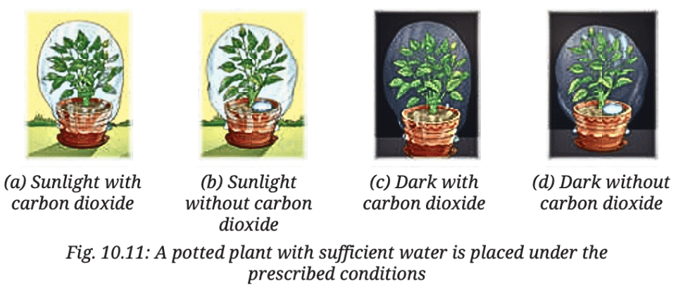 Q7: Vani believes that ‘carbon dioxide is essential for photosynthesis’. She puts an experimental set-up, as shown in Fig. 10.11, to collect evidence to support or reject her idea.