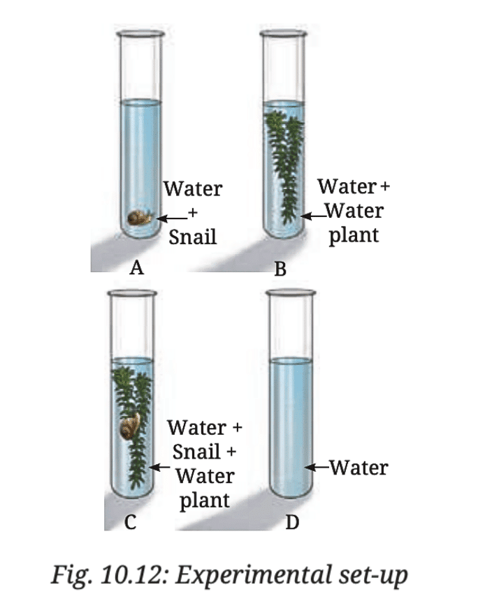 • Test tube D (only water): This is the control test. Since there’s no plant or snail to produce or consume CO₂, any change in the indicator’s color would be due to external factors or the experiment's set-up.