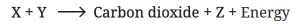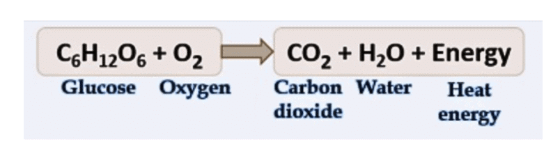 Glucose + Oxygen → Carbon dioxide + Water + Energy