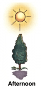 • The angle between the Sun’s rays and the ground is the smallest, resulting in a small, short shadow.