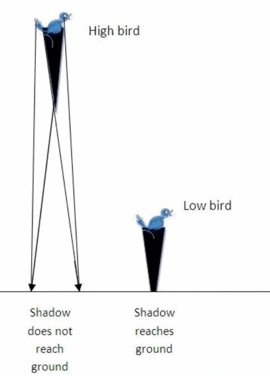 When the bird swoops closer to the ground, its shadow becomes more visible because the light from the Sun is blocked closer to the surface.