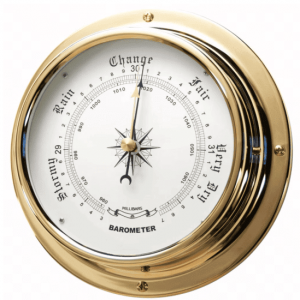 A barometer measures the atmospheric pressure, or the weight of the air around us. Changes in pressure can help predict weather changes. Low pressure often leads to storms, while high pressure generally brings clear, calm weather.