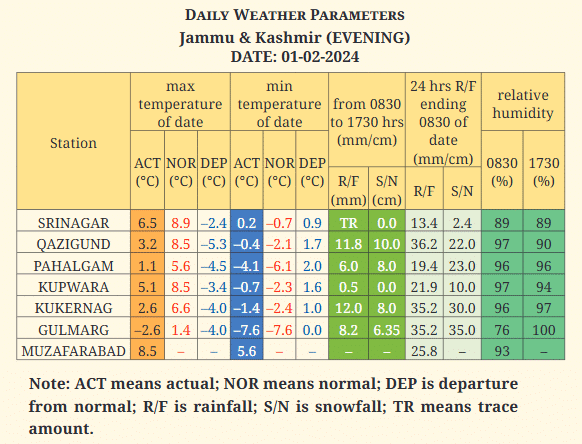 DATE: 01-02-2024Good evening, everyone! Here’s your weather update for Jammu and Kashmir on 01-02-2024. Let’s take a look at the weather across different regions of the state: