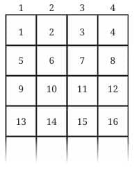 Column 1: 1, 5, 9, 13,…… which starts at 1 and adds 4 each row.