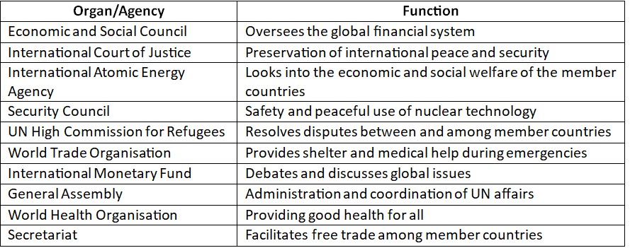 7: Match the principal organs and agencies of the UN with their functions: