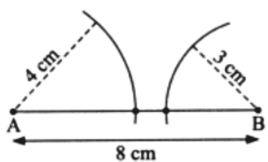 Since the arcs from the points A and B do not meet. So, we are not able to construct the triangle with sidelengths 3 cm, 4 cm, and 8 cm.