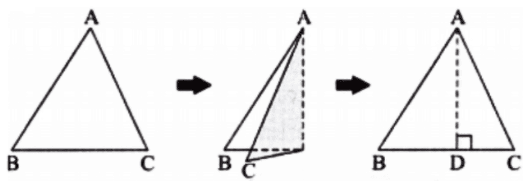The perpendicularity happens because the shortest distance between a point, i.e., a vertex, and a line, i.e., the base is always a perpendicular line.By folding the paper, we construct the shortest distance, ensuring the crease is perpendicular to the base.
