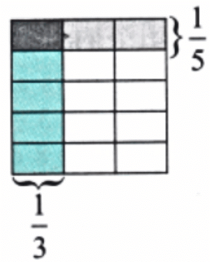1 part shaded = 1/15. Thus, 1/3 × 1/5 = 1/15.