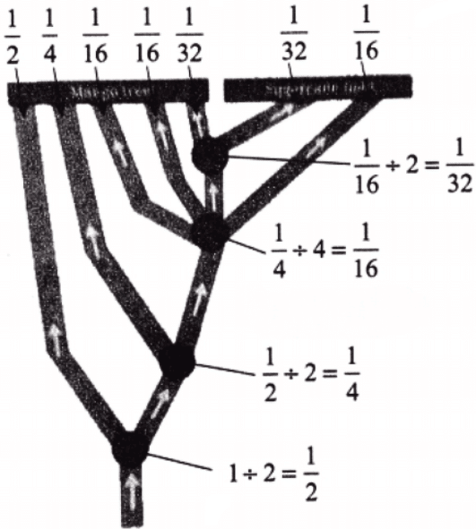 So fraction of ants at each way = 1/2 ÷ 2 = 1/2 × 1/2 = 1/4