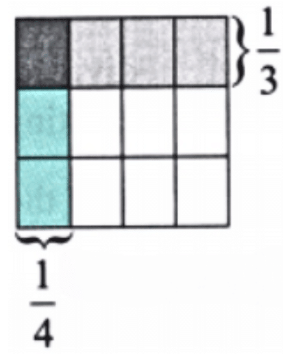 1 part shaded = 1/12. Thus, 1/4 × 1/3 = 1/12.