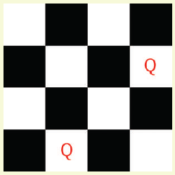Here is a famous chess-based puzzle. From its current position, a Queen piece can move along the horizontal, vertical or diagonal. Place 4 Queens such that no 2 queens attack each other. For example, the arrangement below is not valid as the queens are in the line of attack of each other.