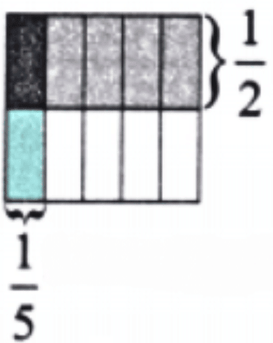1 part shaded = 1/10. Thus, 1/5 × 1/2 = 1/10.
