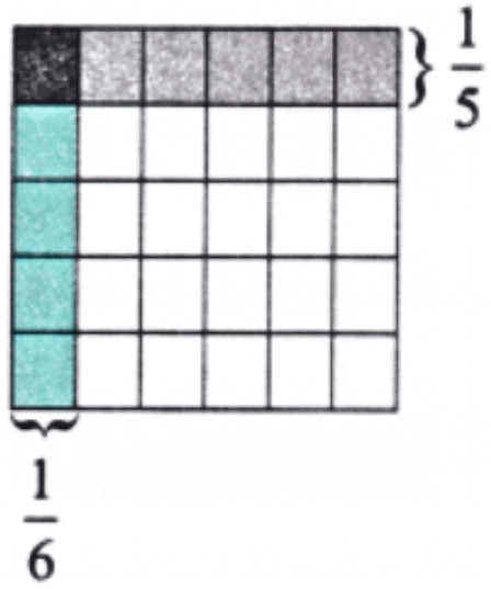 1 part shaded = 1/30. Thus, 1/6 × 1/5 = 1/30.