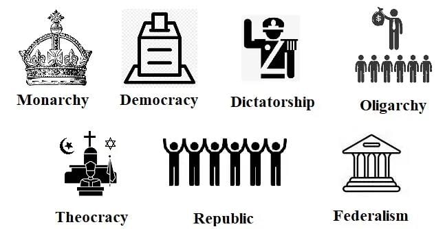 • Democracy – People choose their leaders through voting (e.g., India, USA).• Monarchy – A king or queen rules, either with full power (absolute) or limited power (constitutional) (e.g., Saudi Arabia, UK).