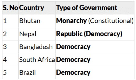 • Nepal (Republic - Democracy): Nepal has a republic, meaning it does not have a king. The country is governed by elected leaders, and the people have the power to choose their government, making it a democracy.
