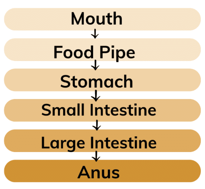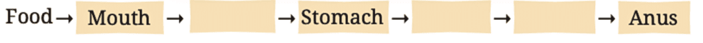 Q1: Complete the journey of food through the alimentary canal by filling up the boxes with appropriate parts.
