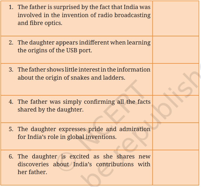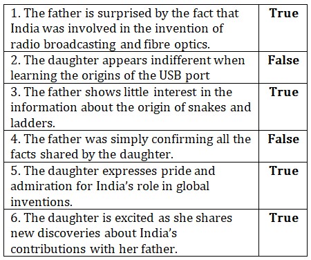 I: You will listen to a conversation between a father and daughter about lesser- known Indian inventions. As you listen, mark the four true statements from (1)â(6) given below.
