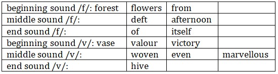 Note the difference between /v/ and /f/. When we pronounce words with /v/ sound, there is a vibration, whereas /f/ sound has no vibration. Both the sounds can occur in the beginning, middle, or at the end of words.
