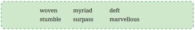 With his 1. ____________ description, the author has written the story beautifully 2. ____________with fascinating details. When you read the story, you will surely enjoy the 3. ____________storytelling technique that attracts all kinds of readers. What makes the story interesting is the superb way of describing the 4. ____________emotions and feelings of the characters. The reader will 5. ____________upon the unexpected twists and turns that 6. ____________ all our understanding and make us wonder at the narrative power of the author
