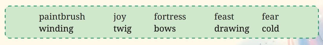 Things: paintbrush, twig, fortress, bows, drawing, feastActions: winding