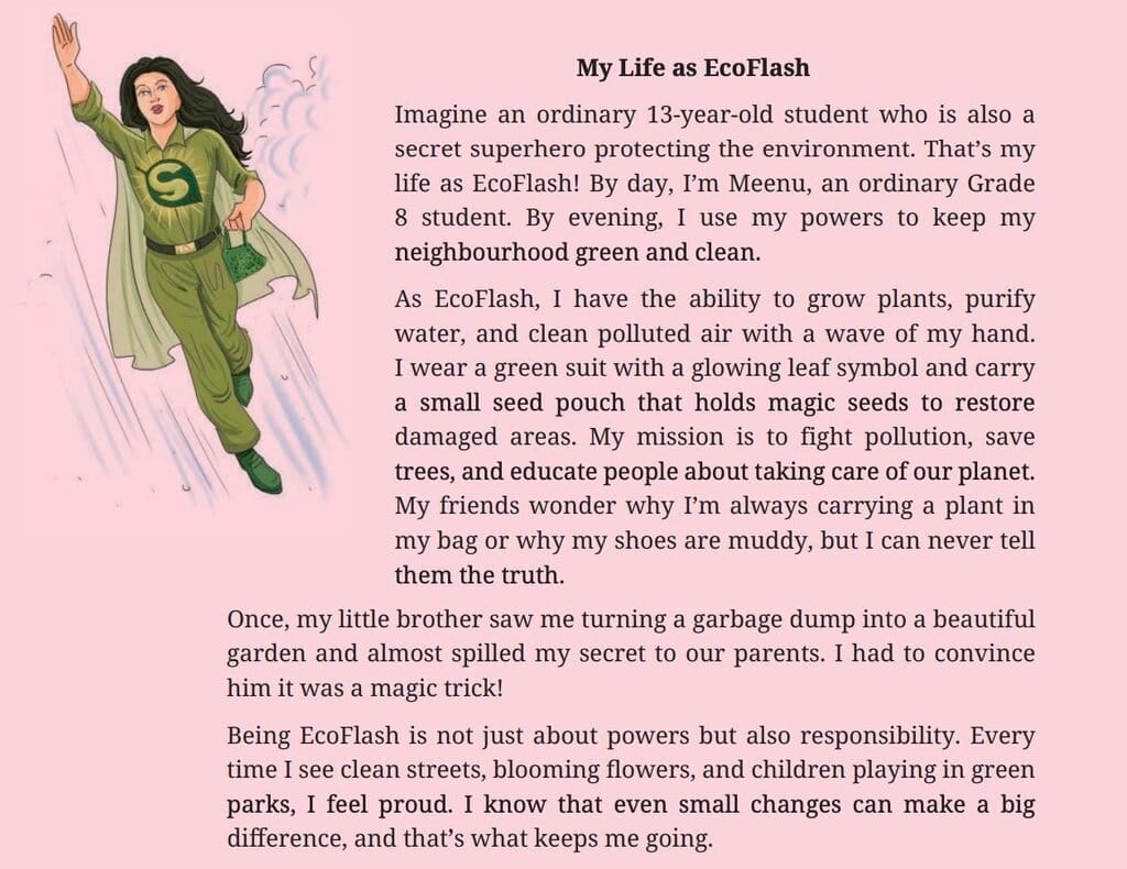 - Captivating opening sentence: Yes, it introduces Meenu as a superhero.