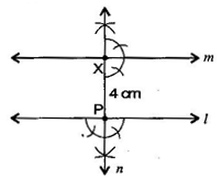 Draw a line l. Draw a perpendicular to ll at any point on l. On this perpendicular choose a point X, 4 cm away from l. Through X, draw a line mm parallel to l.