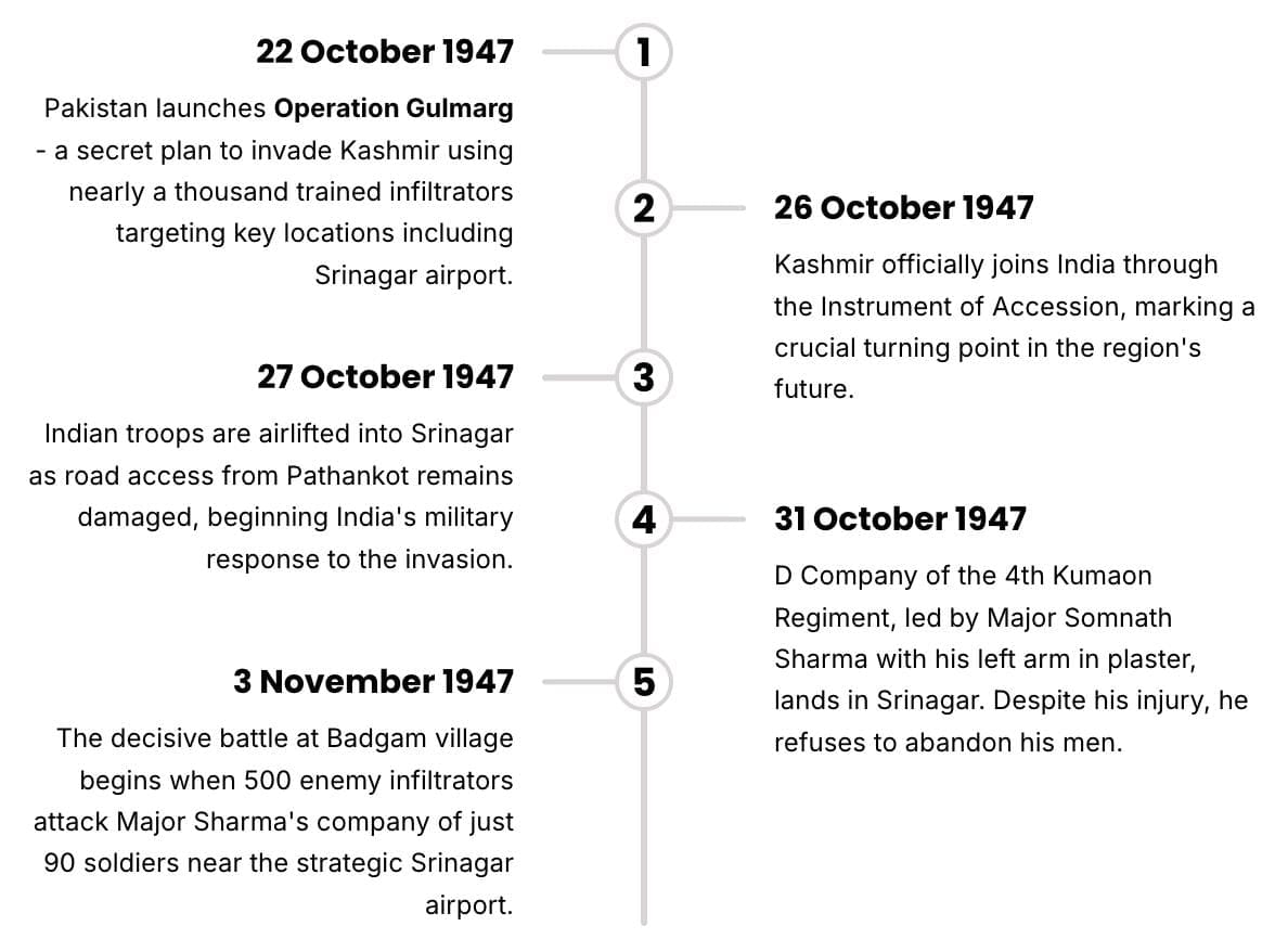 - On October 27, 1947, Indian troops were airlifted into Srinagar to protect the territory. D Company of the 4th Battalion, Kumaon Regiment, led by Major Somnath Sharma, arrived on October 31, 1947.