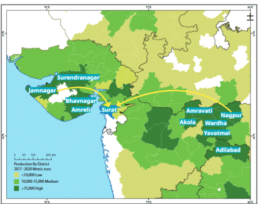 ⢠Raw cotton comes from mandis in Maharashtra and Gujarat, processed into fabric or garments through weaving and dyeing.