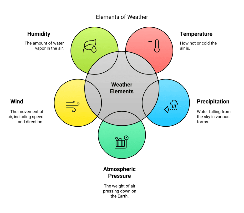 • Weather is described by five main elements: temperature, humidity, precipitation, wind, and atmospheric pressure.• Special instruments like thermometers, rain gauges, barometers, anemometers, and hygrometers are used to measure these elements accurately.