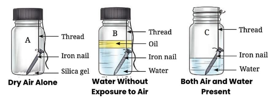 • Rusting happens only when iron comes into contact with both air and water (moist air).