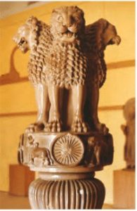 • Sarnath pillar capital: Four lions (symbolizing royal power) and a dharmachakra (wheel of dharma) became India’s national emblem with the motto satyameva jayate (“truth alone triumphs”).