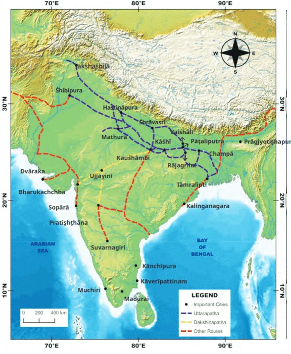 • Important trade routes were Uttarapatha (northwest to east) and Dakṣhiṇapatha (central to south India).