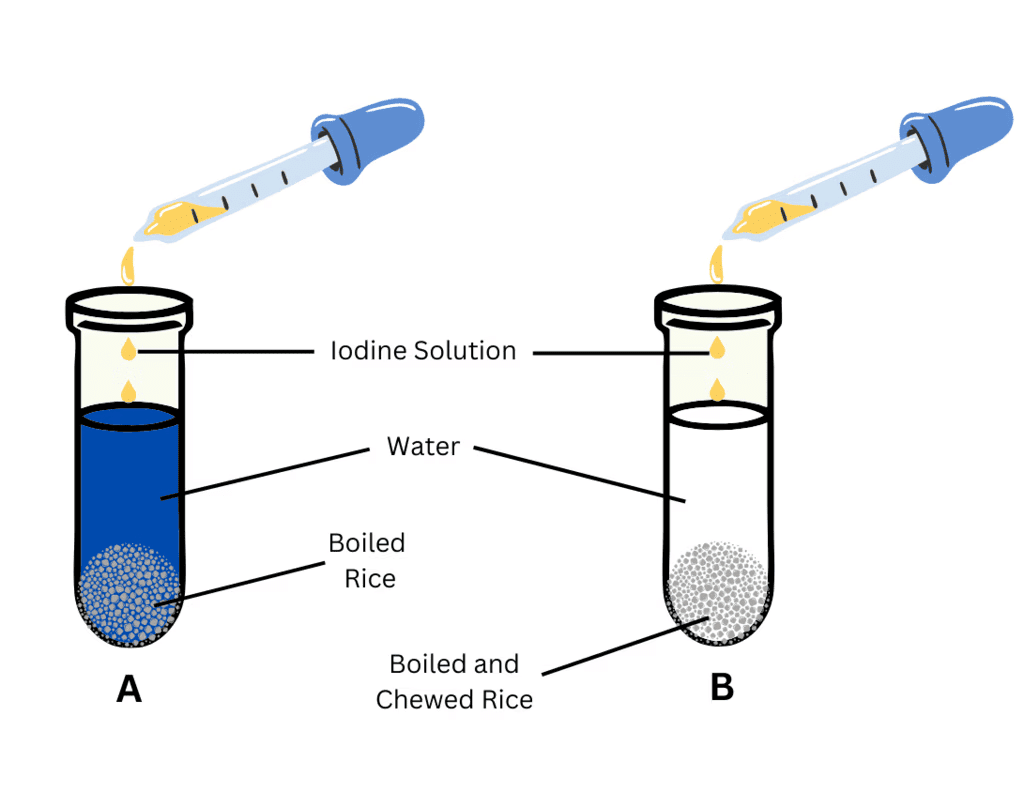 • Place one teaspoonful of boiled rice in test tube A and a teaspoonful of chewed boiled rice in test tube B.Â