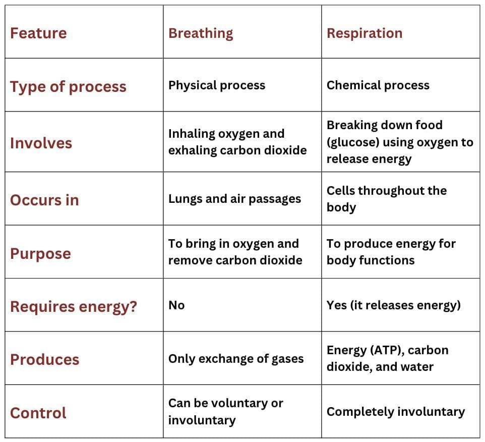 Breathing, a physical process, brings oxygen into the body and removes carbon dioxide, while respiration is a chemical process occurring in cells.
