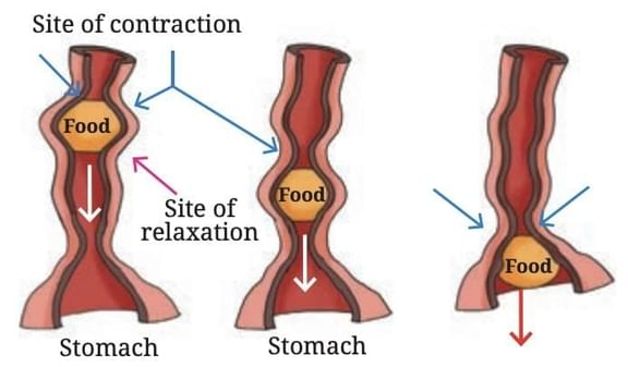 • Food moves down the oesophagus by a wave-like motion called peristalsis, where the walls of the food pipe contract and relax gently.