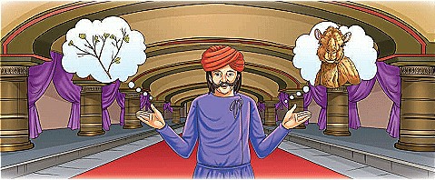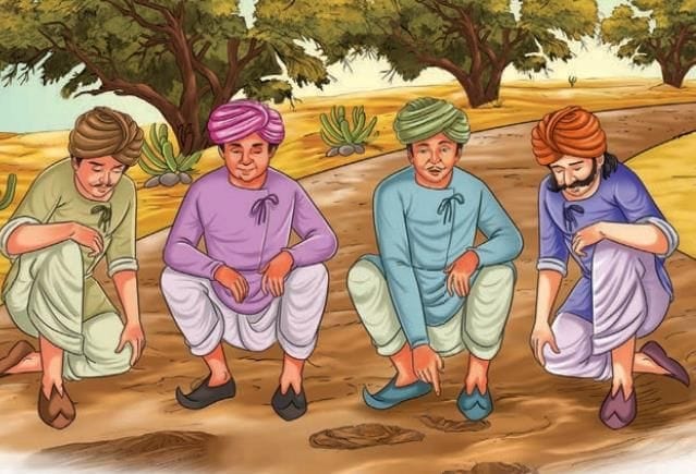 Each of them observes the marks carefully and quietly understands something about the camel. Soon, a merchant comes running towards them, very upset, because his camel has been lost. The young men surprise him by correctly describing the camel—it is lame in one leg, blind in the right eye, has a short tail, and is suffering from stomach pain.