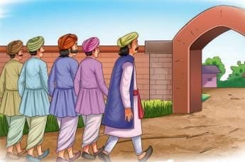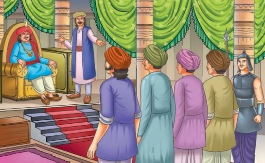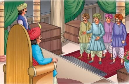 The King then offers the four young men positions as his advisers, praising their intelligence and wisdom. Ram Datt, Shiv Datt, Har Datt, and Dev Datt accept the honour humbly, pledging to serve the King faithfully. The court applauds, celebrating the young men’s success and remarkable insight, marking a triumphant end to their journey.