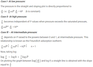 An empirical relationship between the quantity of gas adsorbed by the unit mass of solid adsorbent and pressure at a specific temperature is given by Freundlich adsorption isotherm.