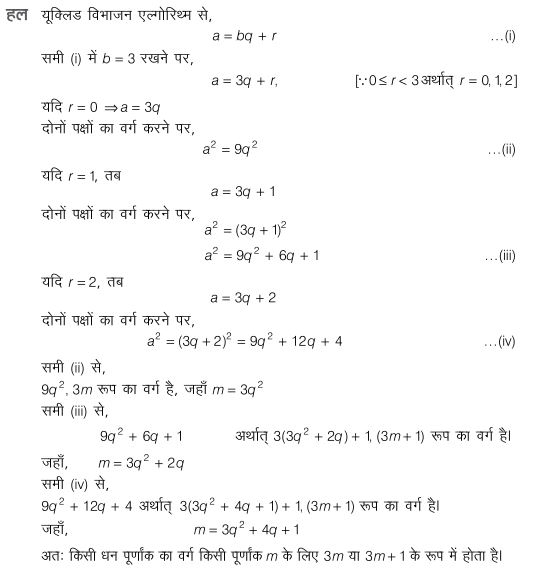 [संकेत-यह मान लीजिए x कोई धनात्मक पूर्णांक है, तब यह 3q, 3g + 1 या 30 +2 के रूप में लिखा जा सकता है। इनमें से प्रत्येक का वर्ग कीजिए और दर्शाइए कि इन वर्गों को 3m या 3m+ 1 के रूप में लिखा जा सकता है।]