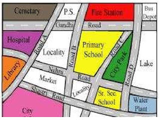 (a) Colour the map as follows: Blue-water, red-fire station, orange-library, yellow