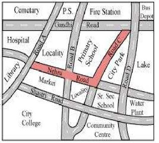 (c) The shortest route from library to the bus stop is indicated in the map in red colour: