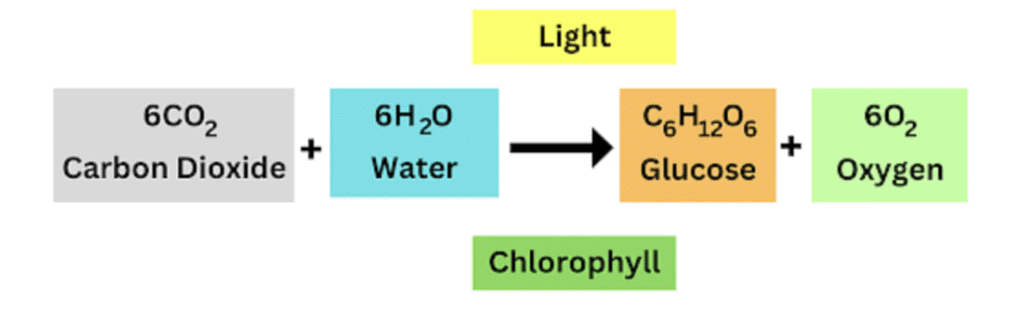 Carbon dioxide + water → carbohydrate + Oxygen (in the presence of sunlight).