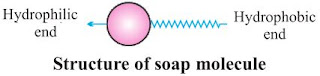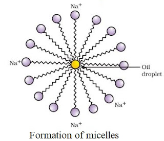 • Most dirt is oily in nature and hydrophobic end attaches itself with dirt and the ionic end is surrounded with molecule of water. This result in formation of a radial structure called micelles.